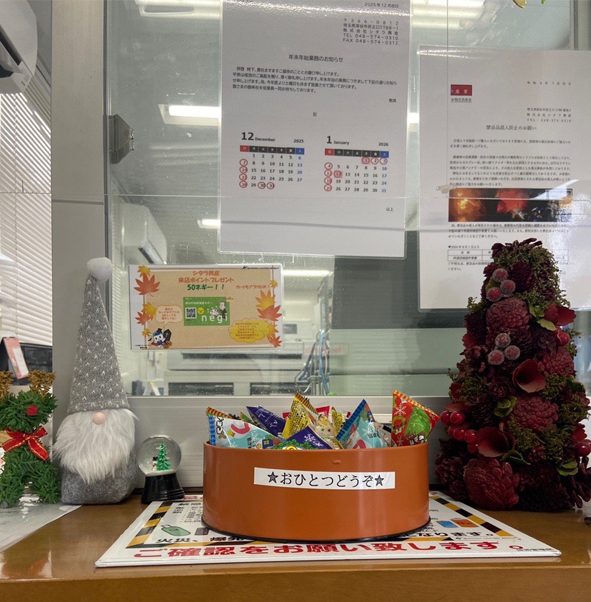 シタラ興産では、ささやかですが、ご来社くださっている皆様にクリスマス用のお菓子を配布しています。 ご自由にお取りください。