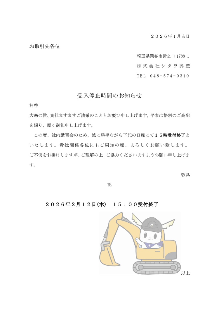 HOME 新着情報 受入停止時間のお知らせ !