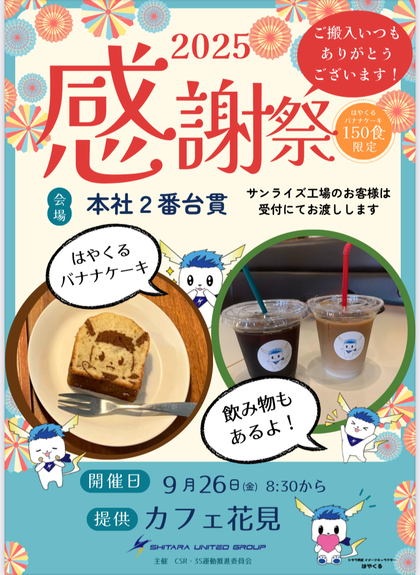 HOME 新着情報 シタラグループ感謝祭のお知らせ!