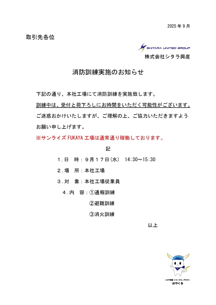 HOME 新着情報 消防訓練実施のお知らせ!